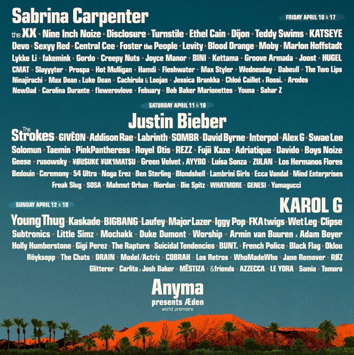 ヘッドライナーは、サブリナ・カーペンター、ジャスティン・ビーバー、カロルGの3組。Creepy Nutsはサブリナ・カーペンターがヘッドライナーを務める10日と17日に出演。藤井はジャスティン・ビーバーの出演日である11日と18日に登場し、BIGBANGはカロルGがヘッドライナーを務める12日と19日に出演する。