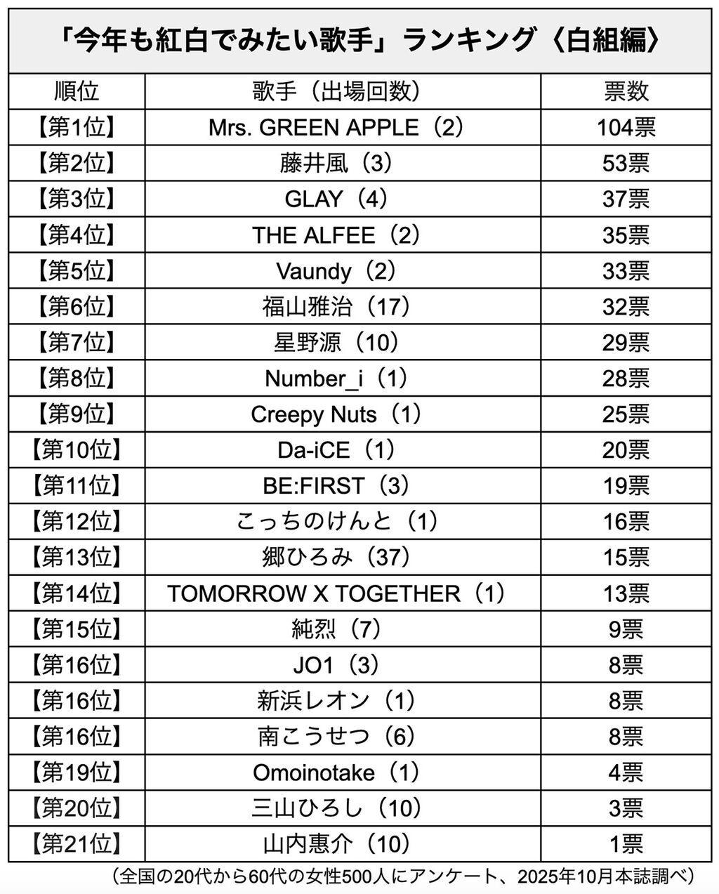 出場歌手の発表は、例内だと11月中旬になるが、本誌はひと足早くアンケート調査を実施。「紅白でみたい歌手は誰?」を全国の20代から60代の女性500人にきいた。対象としたのは、2024年の紅白に出場した歌手・グループ(特別企画・追加出場枠などは除く)。